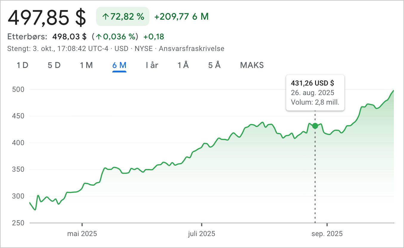 Efter et mindre fald i starten af september, er Caterpillars aktier fortsat steget kraftigt på New York Stock Exchange i løbet af den seneste måned. Ved lukketid fredag den 3. oktober, var prisen 497,85 amerikanske dollars, den højeste nogensinde.