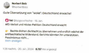 »Undskyld mig? Avisen Taz har overskriften ‘Tyskland vågner’, som blev kommenteret af Norbert Bolz. ‘God oversættelse af Woke: Tyskland vågner’ og få deres hus ransaget? Du har mistet kontrollen. Dette er et misbrug af retssystemet mod ytringsfriheden.«
