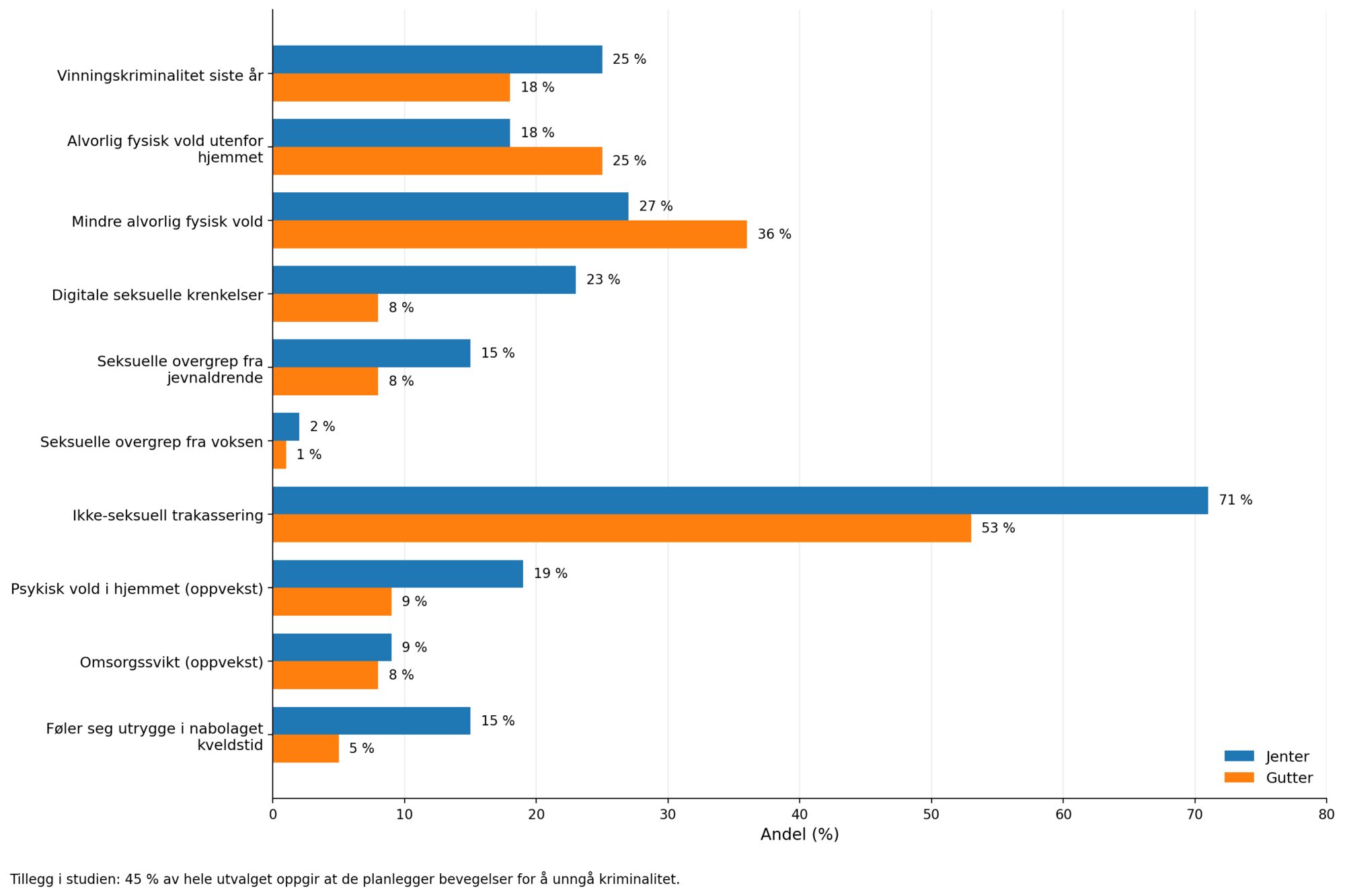 15 procent af pigerne siger, at de føler sig utrygge i deres eget nabolag om natten, sammenlignet med 5 procent af drengene. Bekymring om digitalt misbrug er mest udbredt og rapporteres af 14 procent.