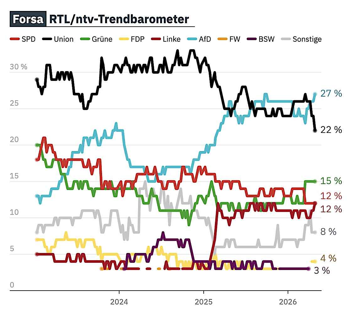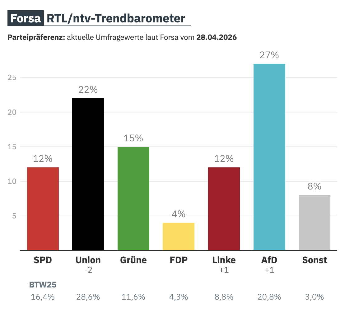 I en meningsmåling foretaget af Forsa for RTL/n-tv får AfD i øjeblikket støtte fra 27 procent af de adspurgte, sammenlignet med 22 procent for unions partierne.